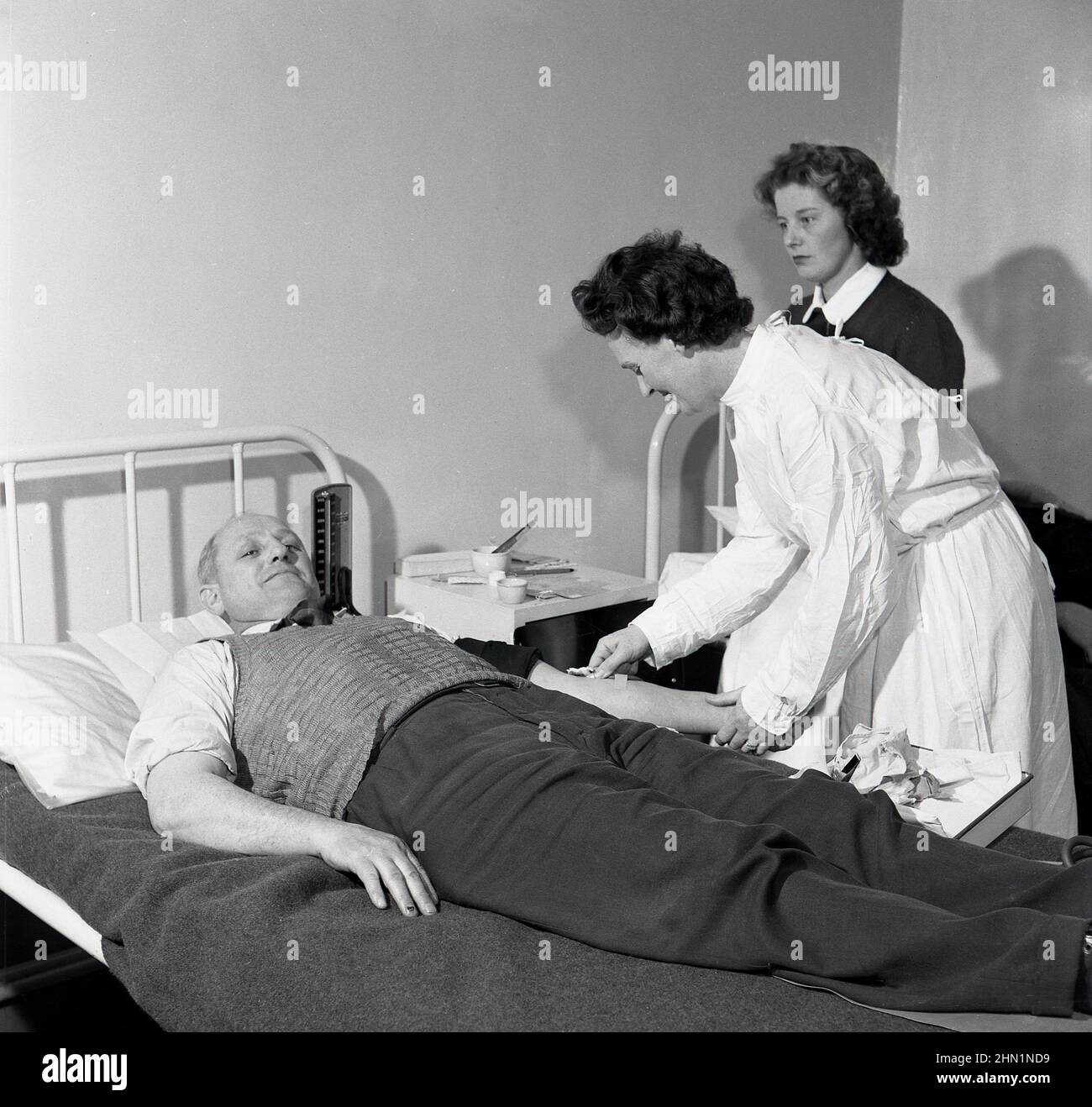 1950s Historical A Male Steel Worker Lying On A Metal Bed Having A Blood Test Done By A Factory Nurse Wales England Uk Stock Photo Alamy